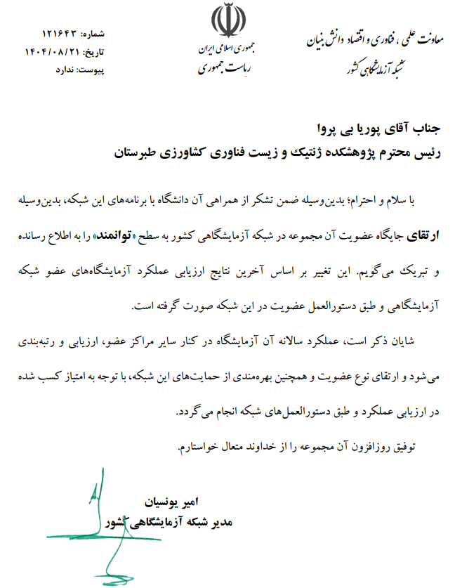 بر اساس ارزیابی سال ۱۴۰۴ شبکه آزمایشگاهی فناوریهای راهبردی معاونت علمی، فناوری و اقتصاد دانشبنیان ریاستجمهوری، پژوهشکده ژنتیک و زیستفناوری کشاورزی طبرستان دانشگاه علوم کشاورزی و منابع طبیعی ساری از سطح «فعال» به سطح «توانمند» ارتقا یافت. این پژوهشکده که از سال 1401 بهعنوان عضو «آزمایشی» و از سال ۱۴۰2 بهعنوان عضو «فعال» در شبکه آزمایشگاهی کشور فعالیت کرده است، اکنون در زمره مراکز آزمایشگاهی توانمند کشور قرار گرفته و این موفقیت نتیجه ارتقای کیفیت و تنوع خدمات آزمایشگاهی تخصصی، توسعه و بهروزرسانی زیرساختها و تجهیزات پیشرفته، تقویت نیروی انسانی متخصص و پایبندی به استانداردهای ملی است. دکتر پوریا بیپروا، رئیس پژوهشکده ژنتیک و زیستفناوری کشاورزی طبرستان، این ارتقا را نقطه عطفی در کارنامه پژوهشکده و نشاندهنده رشد پایدار و بلوغ علمی و اجرایی این مجموعه دانست و ابراز امیدواری کرد با تداوم این روند، نقش مؤثرتری در زیستبوم نوآوری و پژوهش کشاورزی کشور ایفا شود. دکتر سید حمید رضا هاشمی، معاون پژوهشی پژوهشکده، نیز ضمن تأکید بر اینکه دستیابی به سطح «توانمند» حاصل کار تیمی، بهبود مستمر فرآیندها و سرمایهگذاری هدفمند بر توان تخصصی همکاران است، این جایگاه را عامل دوچندان شدن مسئولیت پژوهشکده در ارائه خدمات دقیقتر و باکیفیتتر به دانشگاه، مراکز تحقیقاتی و صنعت عنوان نمود. همچنین سرکار خانم اصغرزاده، مسئول شبکه آزمایشگاهی پژوهشکده، با قدردانی از تلاشهای همکاران و رعایت دقیق استانداردها، بر تعهد مجموعه برای حفظ و ارتقای این سطح از کیفیت و گسترش خدمات به پژوهشگران سراسر کشور تأکید نمود. ارتقای پژوهشکده ژنتیک و زیستفناوری کشاورزی طبرستان به سطح «توانمند» گامی مهم در افزایش ظرفیت ارائه خدمات آزمایشگاهی پیشرفته، حمایت از طرحهای کلان ملی در حوزه زیستفناوری کشاورزی و تقویت جایگاه دانشگاه علوم کشاورزی و منابع طبیعی ساری در نظام نوآوری و فناوری کشور به شمار میرود و روابط عمومی دانشگاه، این دستاورد ارزشمند را به اعضای هیئتعلمی، کارکنان و دانشجویان پژوهشکده و دانشگاه تبریک گفته و برای آنان آرزوی توفیق روزافزون دارد.